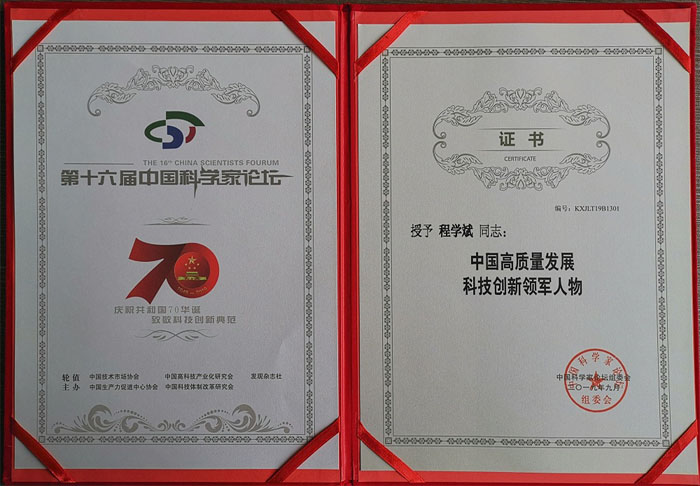 在2019年,公司荣获“中国科技创新领军企业”、程学斌荣获“中国高质量发展科技创新领军人物”